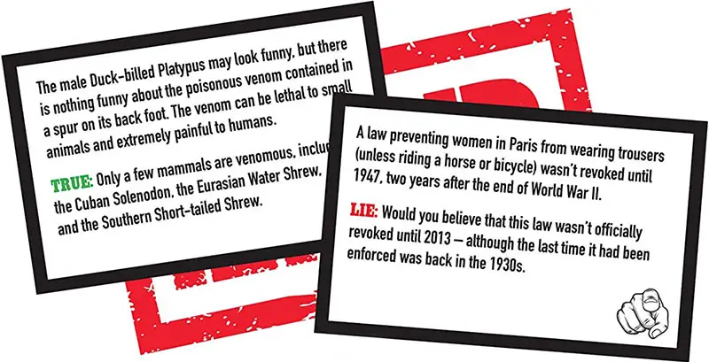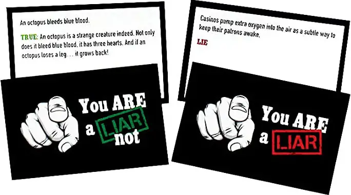 Example: If you are playing with 4 players, one player is the "guesser" which means there are 3 players that need to select cards. As a group, you may select 2 TRUE and 1 LIE, or 1 TRUE and 2 LIE, or 3 LIE cards. But the group may not select 3 TRUE cards.