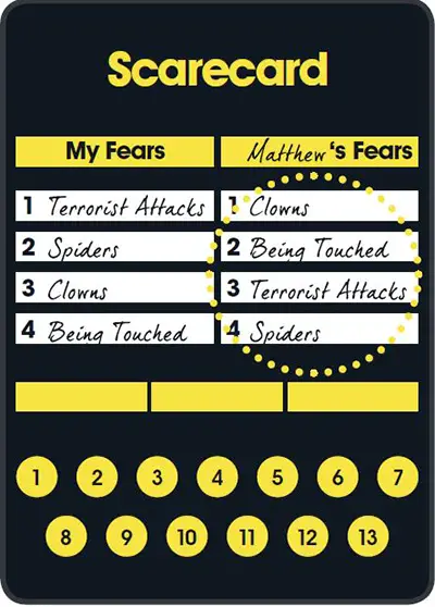 All players secretly fill in the left column of their Scarecards ("My Fears") ranking the fears shown in order of what scares them most, with 1 being the scariest and 4 being the least scary.