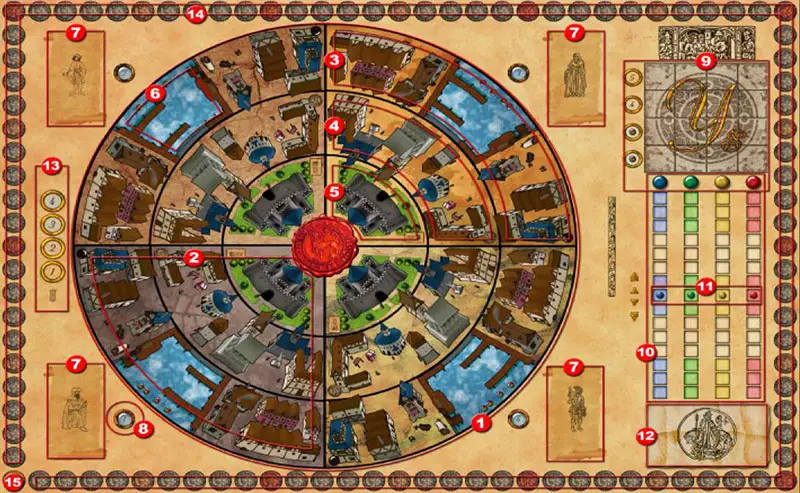 1The city of Ys.2Neighborhood.3Port area.4Commercial area.5Palace area.6Port.7'Character cards places.8Neighborhood number.9Marketplace.10Gems quotation scale.11Starting point for the quotations.12Throne room.13Turn counter.14Score track.15Starting point for the score.