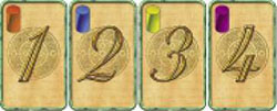 In the last turn, all the yellow-edged cards are exhausted. At this point, the four blue-edged 'character' cards are put into play. There is a white gem on each. The players who obtain the majority in the four palaces will take these cards and exchange them immediately with a blue, red, green or yellow gem taken from the bank.