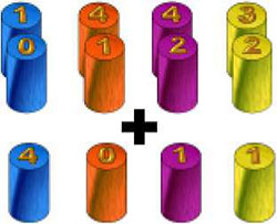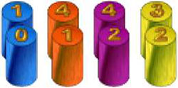 Example (continued) : The players take two brokers and reveal them simultaneously. Blue's total is 1 (1+0). Orange's is 5 (4+1). Purple's is 6 (4+2) and Yellow's is 5 (3+2).