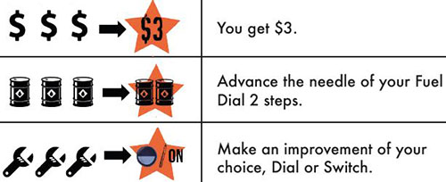 Advance the needle of your Fuel Dial 1 step and draw 1 Ticket Card if you only board red dice (Boarding Phase).
