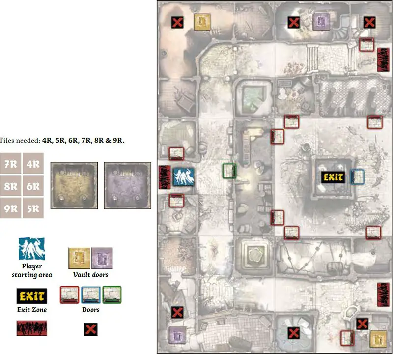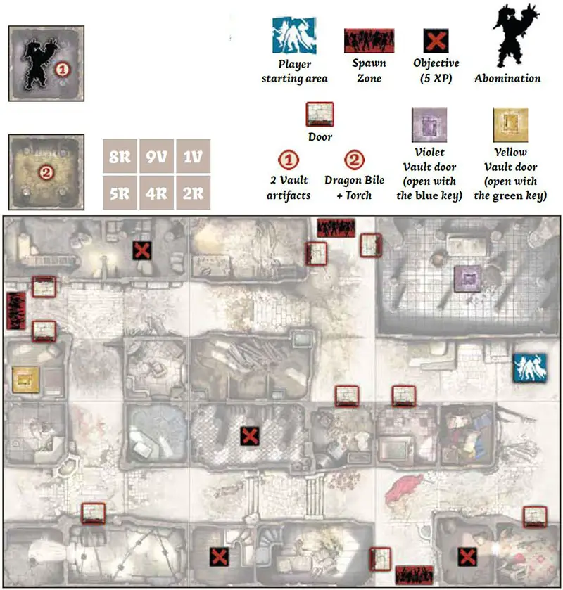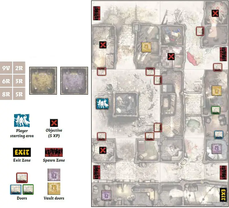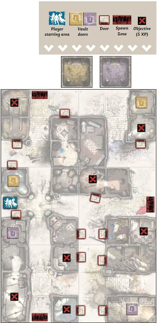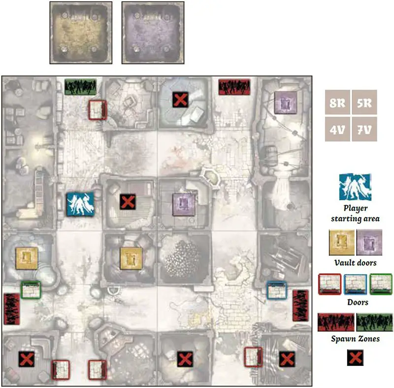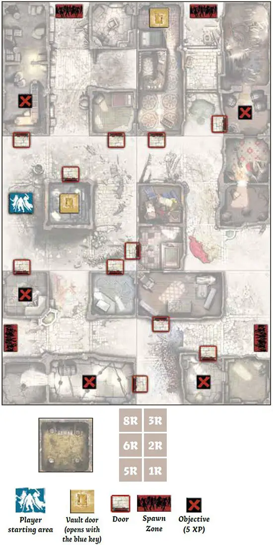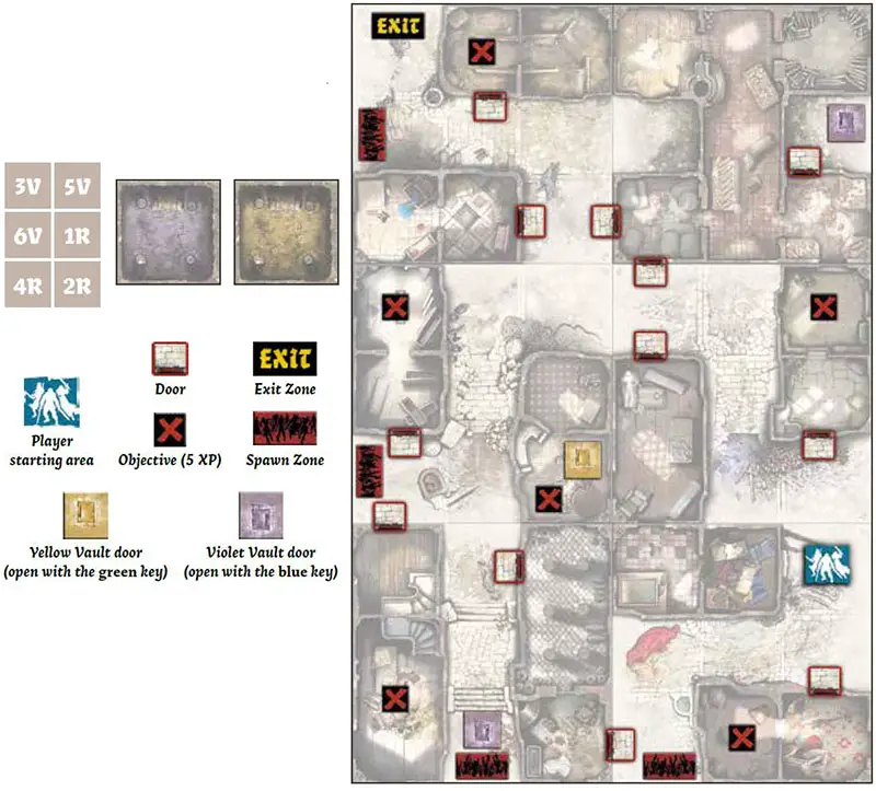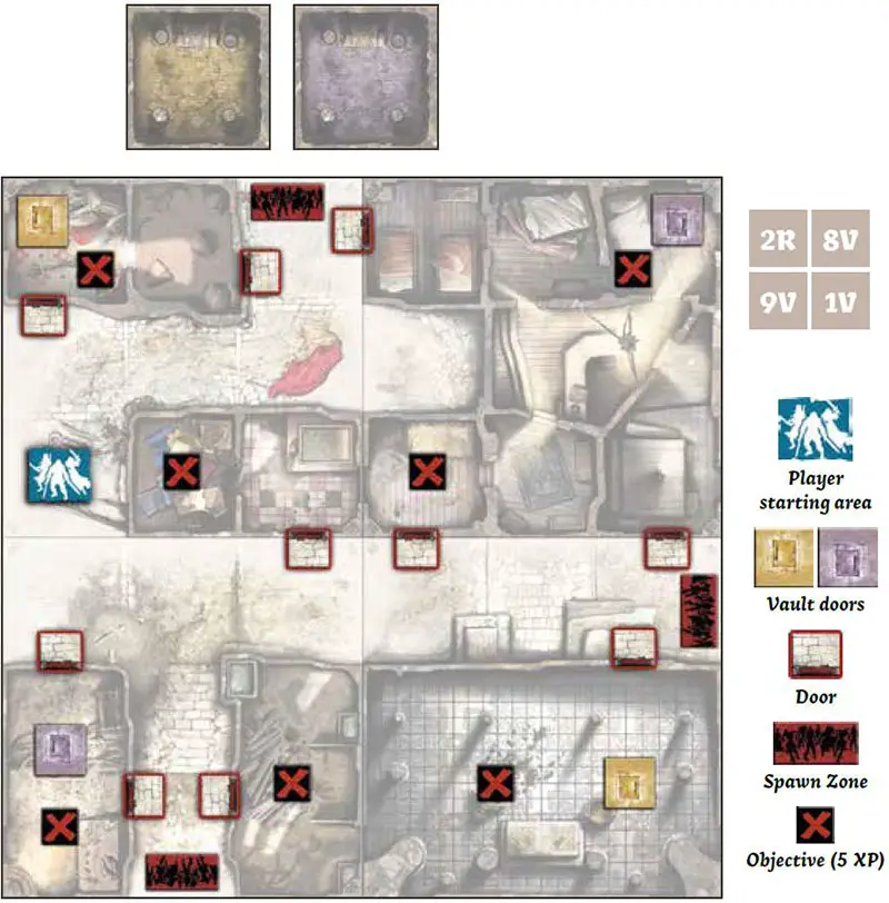 Get the artifacts. Get both Vault artifacts. Then, Reach the Exit Zone with all Survivors. Any Survivor may escape through this Zone at the end of his turn, as long as there are no Zombies in it.