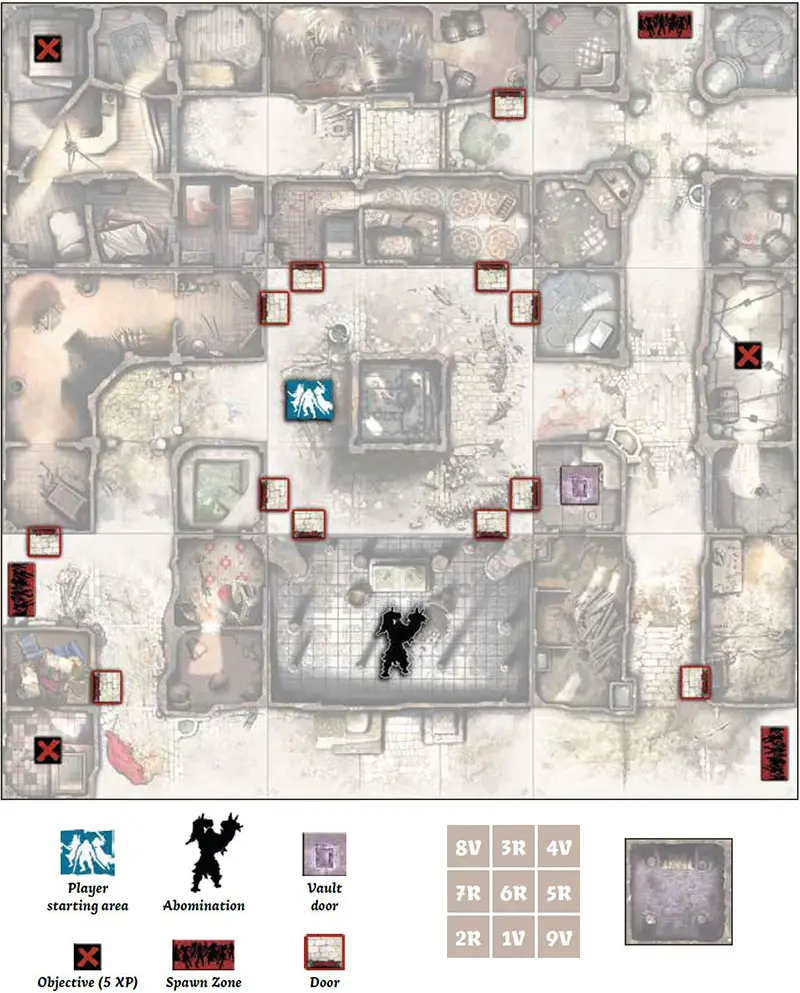 Exorcism, survivors' style: Zombicide! Take both Vault weapons and kill the Abomination to win the game.