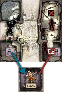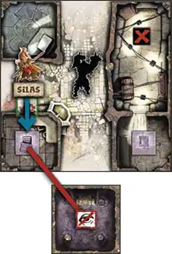 Step 1. Silas needs to go through the violet Vault to get the Dragon Bile and Torch represented by the Objective. He Moves in and opens the violet Vault door. There is no Zombie Spawn in a Vault, and Silas has no Line of Sight to it.