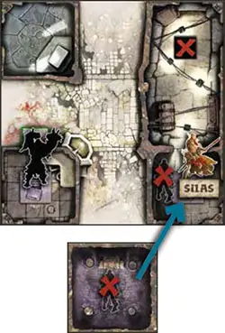 Step 2. Silas Moves into the violet Vault. He opens the other violet Vault door from the inside, triggering a Zombie Spawn in the building. Two Walkers are here! The Elf has no Line of Sight on the other side, and thus can't shoot to kill the Zombie standing right there.