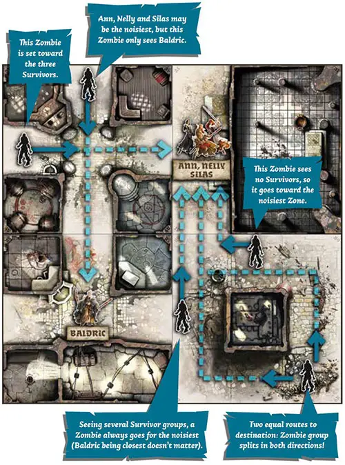 First is the Zone with Survivors in Line Of Sight that has the most Noise tokens. Remember, each Survivor counts as a Noise token.