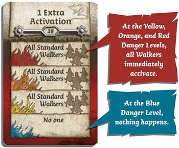 When you reveal an Extra Activation card, no Zombies appear in the designated Zone. Instead, all Zombies of the indicated type immediately get an extra Activation (see Activation step, page 23). Notice that these cards have no effect at the Blue Danger Level!