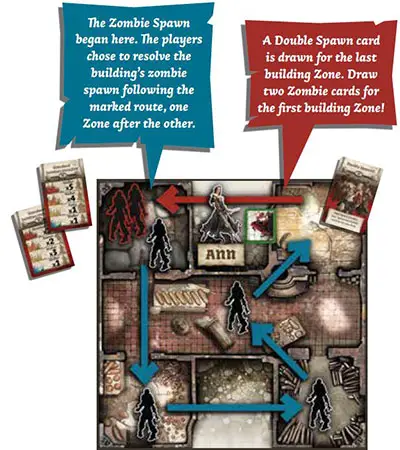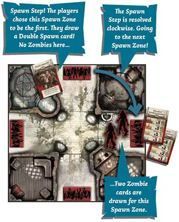 Repeat this for each Spawn Zone. Always begin with the same Spawn Zone and continue clockwise. When the Zombie deck runs out, reshuffle all the discarded Zombie cards to make a new deck.