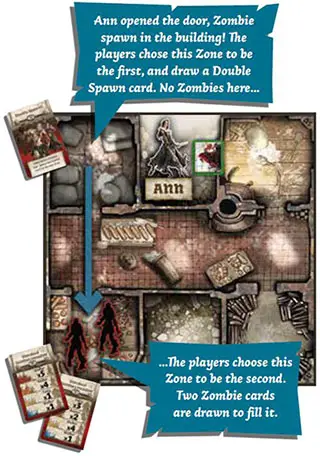 When you draw a Double Spawn card, no Zombies appear in the designated Zone. The next Zombie Spawn is resolved by drawing two Zombie cards instead of one for the next Spawn Zone (if drawn during Spawn Step) or building Zone (if drawn when spawning in a building).