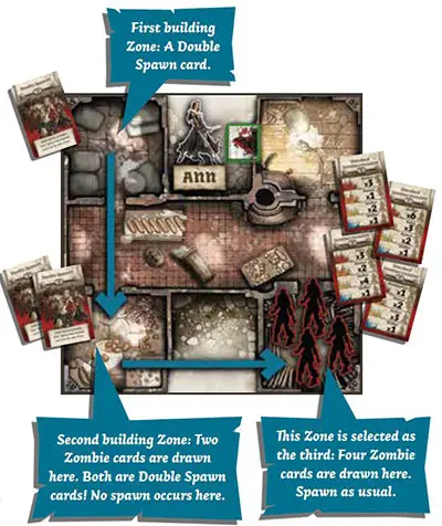 If the Double Spawn card is drawn for the last Spawn Zone or building Zone, use it for an extra double Spawn on the first Spawn Zone or first building Zone (even if you previously spawned Zombies in it!).