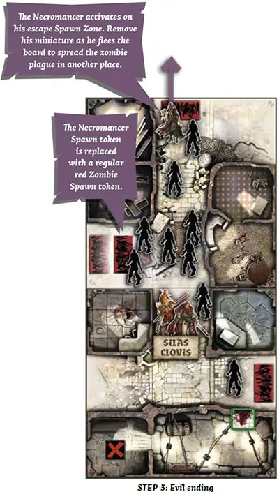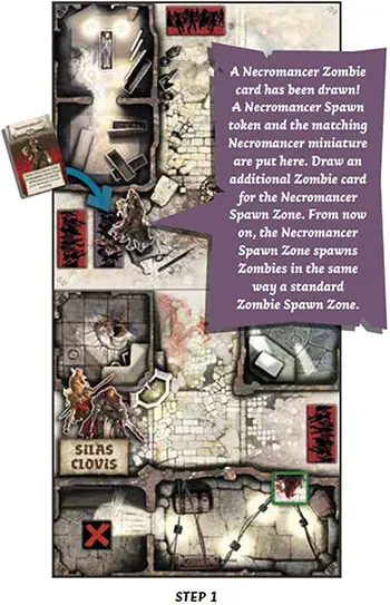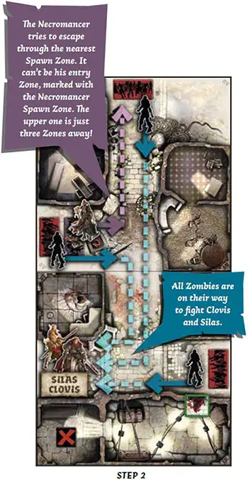 A Necromancer tries to flee the board. If there are no Survivors in his Zone for him to Attack during his Activation (see Zombies' Phase, page 23), he Moves 1 Zone toward the nearest Spawn Zone (NOT his entry Zone), ignoring any Survivors he might see. If several escape Spawn Zones are at the same distance, choose one.