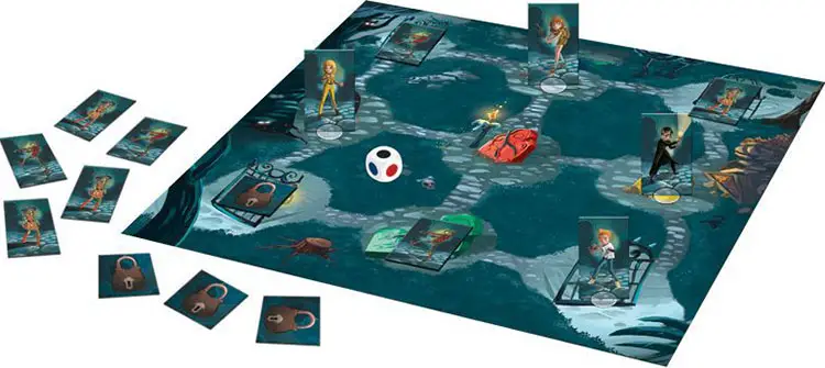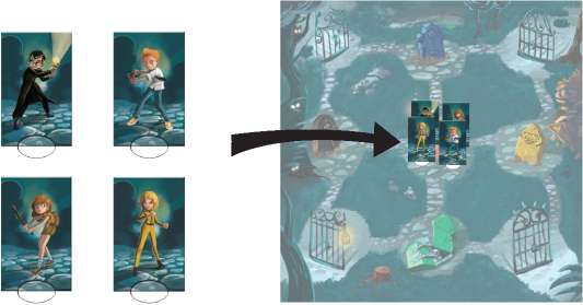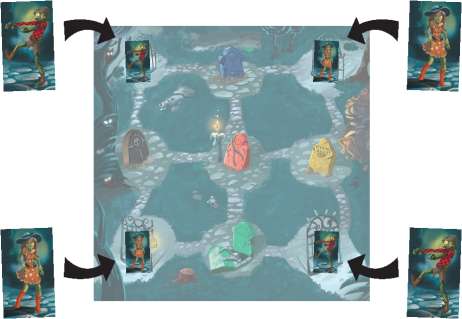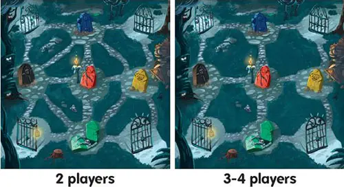 Each player chooses a player pawn and places it on the red tomb at the center of the board. Put the unused player pawns back in the box.