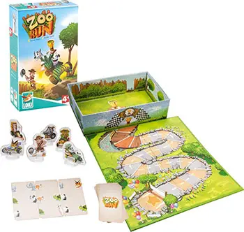 Zoo run is two games in one! The first, "Free the Animals" is a cooperative game for ages 4 and up. The second, "The Race of the Year" is a competitive game recommended for ages 6 and up. You can play both games, one after the other, or just play one of them. Have fun!