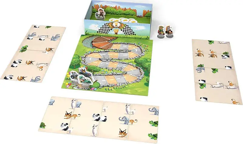 Choose an animal to be your favorite and help them cross the finish line! Line up your cards to form animals and pick up Crowns to win!